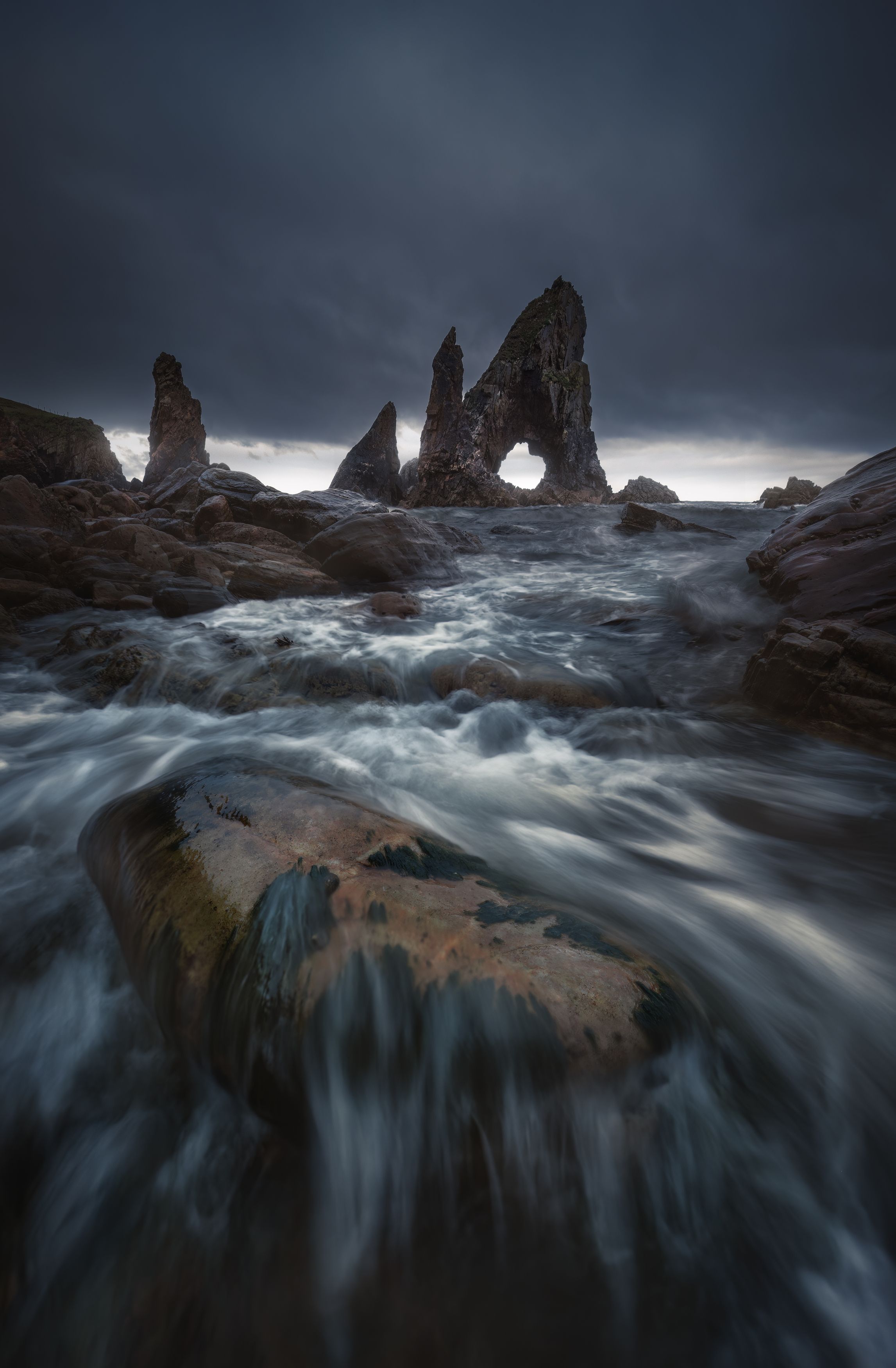 Темные облака сжимают горизонт, а волны, словно живые, обвивают камни, оставляя на них следы бури. Долгая выдержка застывает движение воды в плавной дымке, усиливая ощущение мощи и одиночества. Скалы, как древние стражи, высятся в тумане, словно хранят тайны моря. Это не просто пейзаж — это мгновение, когда природа обнажает свою суровую поэзию.