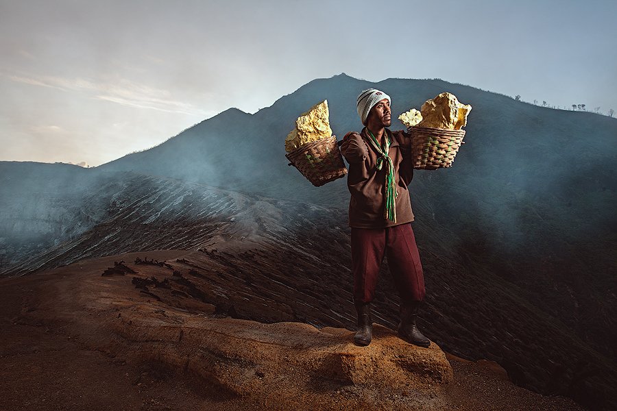 Тем не менее, в кратере вулкана вручную добывается сера для промышленных нужд. Носильщики серы набивают по 70 - 80 кг сырья в специальные корзины, неся их в одну ходку. Дневная зарплата работника - около 5 долларов. Средняя продолжительность жизни индонезийского добытчика серы составляет 30 лет...