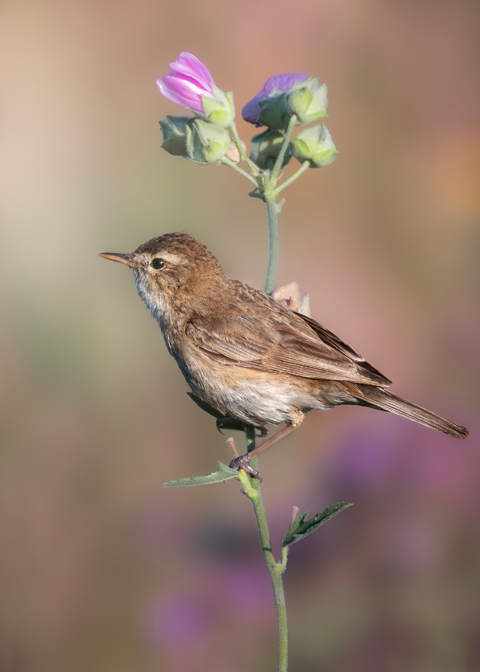 Северная бормотушка на тонком стебле с розовыми бутонами — кадр с хорошей композицией и естественным освещением, в котором птица выглядит уравновешенно и в своей среде. Мягкий фон подчёркивает детали оперения, можно было бы чуть больше акцента на глазу, но в целом — достойный снимок.