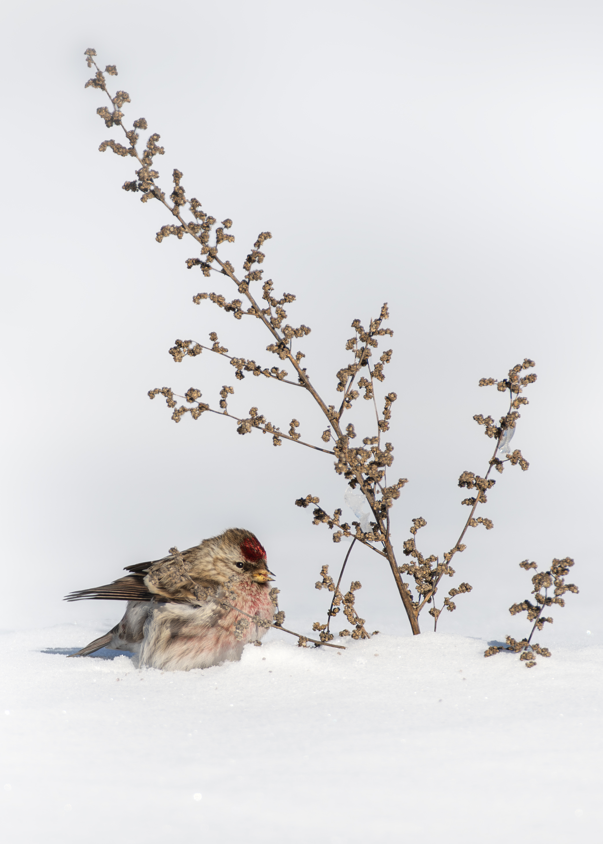 Чечетка в снегу — тихий кадр, где птица и сухая ветвь почти сливаются с белым фоном. Видно, как перья припорошены, а взгляд птицы — сосредоточен. 🐦❄️