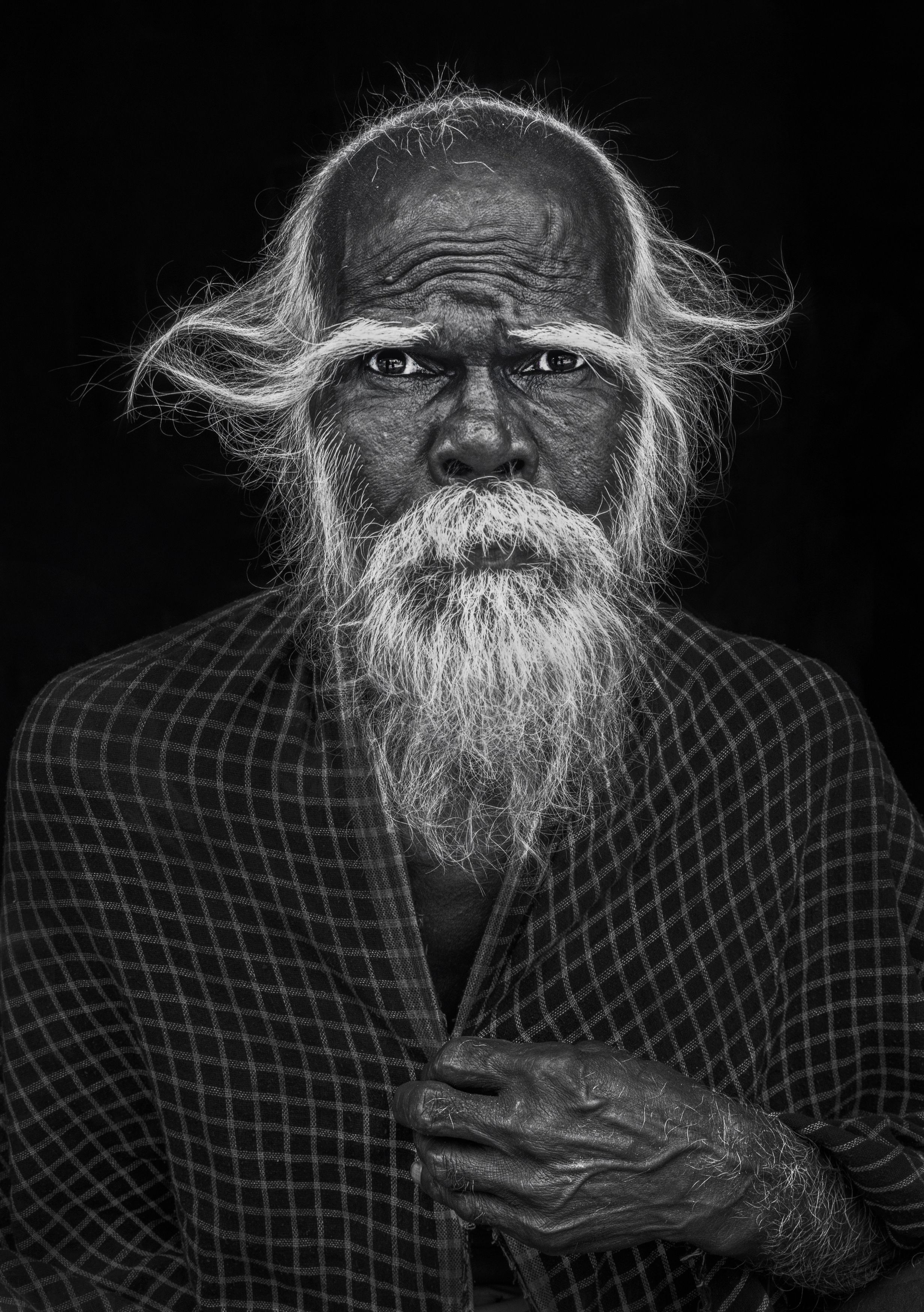 Черно-белый снимок передает глубину и интенсивность образа пожилого человека. Его лицо, испещренное морщинами, и пронзительный взгляд создают ощущение внутренней силы и жизненного опыта. Борода и вьющиеся волосы подчеркивают индивидуальность, а текстура кожи и одежды добавляют реалистичности. Фотография выстроена на контрасте света и тени, что усиливает драматизм и выразительность образа. Работа отражает уважение к старшему поколению и человеческой душе.