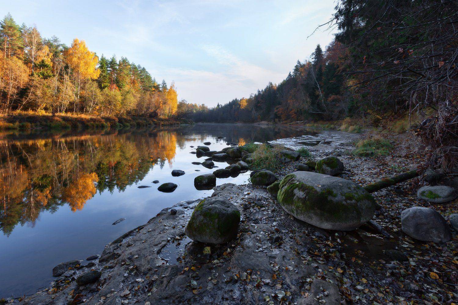 Рассвет. Вспоминается золотая осень на берегах любимой реки Гауя. Кое-где песчаный берег подмыт, образовались живописные обрывы. Старая сосна нависла над водой, а накренившаяся осина и березы тронуты багрянцем осени. Все тихо и спокойно, душа радуется. Ее заслуженно считают живописнейшей рекой Латвии, красота реки и ее окрестностей воспета как в народных песнях, так и в произведениях латышских поэтов, композиторов, живописцев. Часть реки протекает по знаменитому и красивейшему Национальному парку Гауя, эту местность еще иногда называют Видземской Швейцарией. Река богата и рыбой, осенью на нерест приходят лососи и можно наблюдать за ними на отмелях, иногда они выпрыгивают нарушая тишину спокойного утра. Всегда приятно погулять по берегам этой чудесной реки, а осенью особенно...