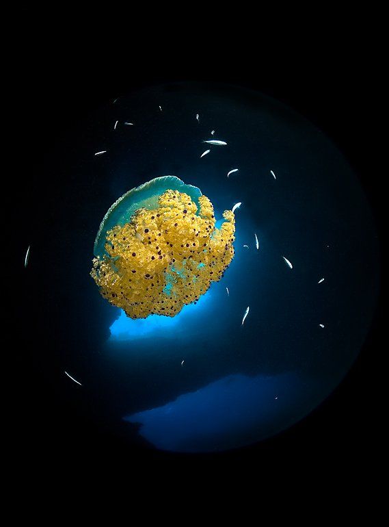 Продолжаю изучать возможности применения циркулярного объектива под водой. Главный плюс очевиден: объекты средних размеров можно фотографировать с расстояния всего нескольких сантиметров, что снижает влияние невысокой прозрачности воды. Другая сложность - правильное использование характерных циркулярных искажения объектива. Некоторые фотографии удачнее смотрятся выпрямленными специальными плагинами в фотошопе, некоторые - в виде оригинального круга.