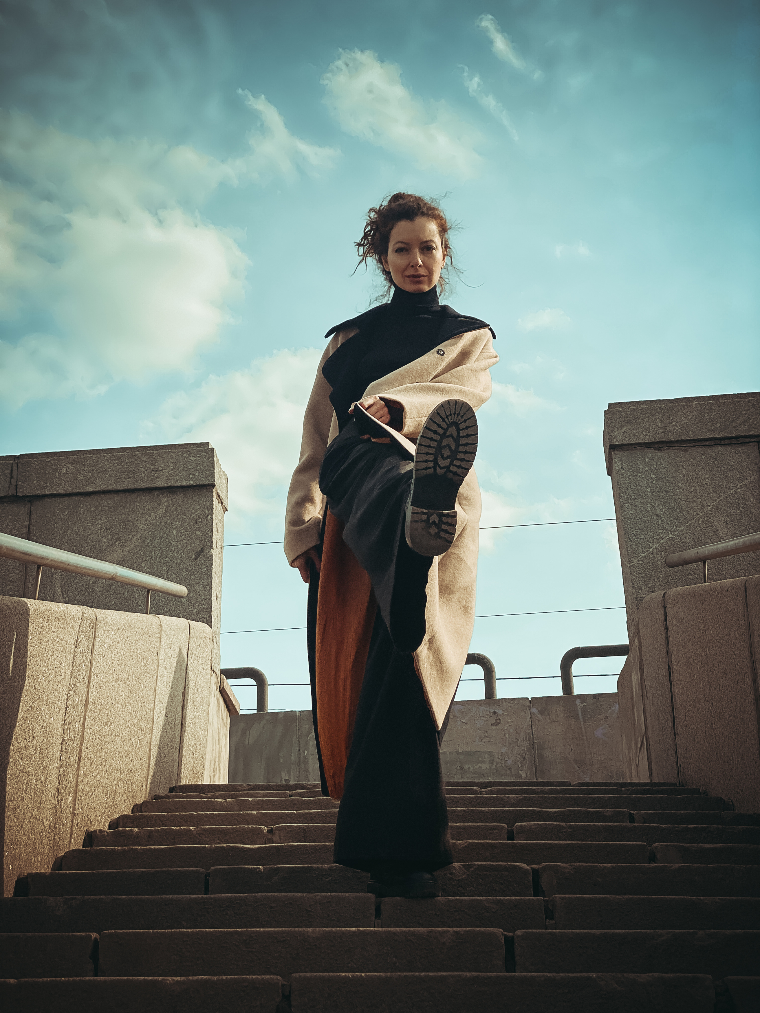 Вы использовали ракурс снизу вверх, что усиливает присутствие фигуры на лестнице — сильный визуальный акцент. Контраст светлого пальто и тёмной одежды подчёркивает силуэт, а поднятая нога добавляет динамики. Композиция чёткая, но можно было бы чуть сильнее обыграть глубину пространства за счёт фокуса.
