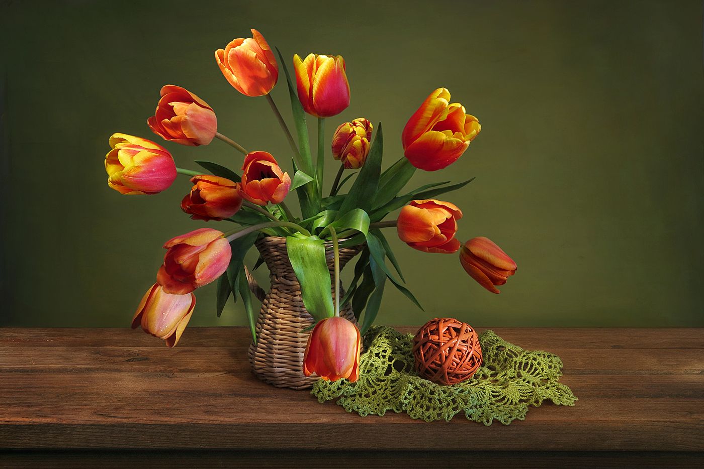 натюрморт,весна,тюльпаны,салфетка,шар,плетеная ваза, Алла Шевченко