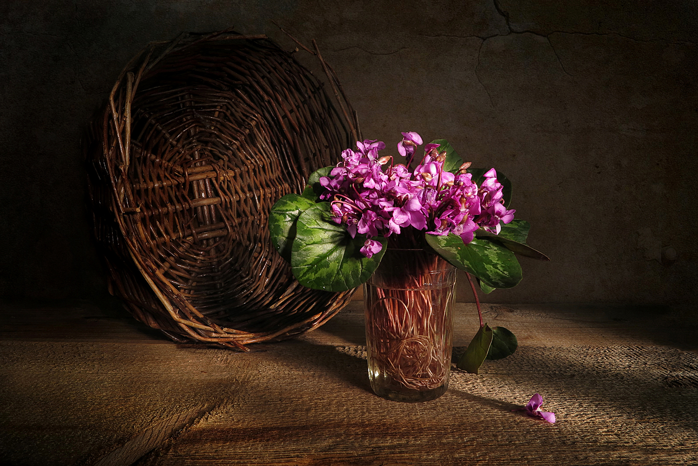 натюрморт, весна, корзина, фиалки, стакан, Алла Шевченко