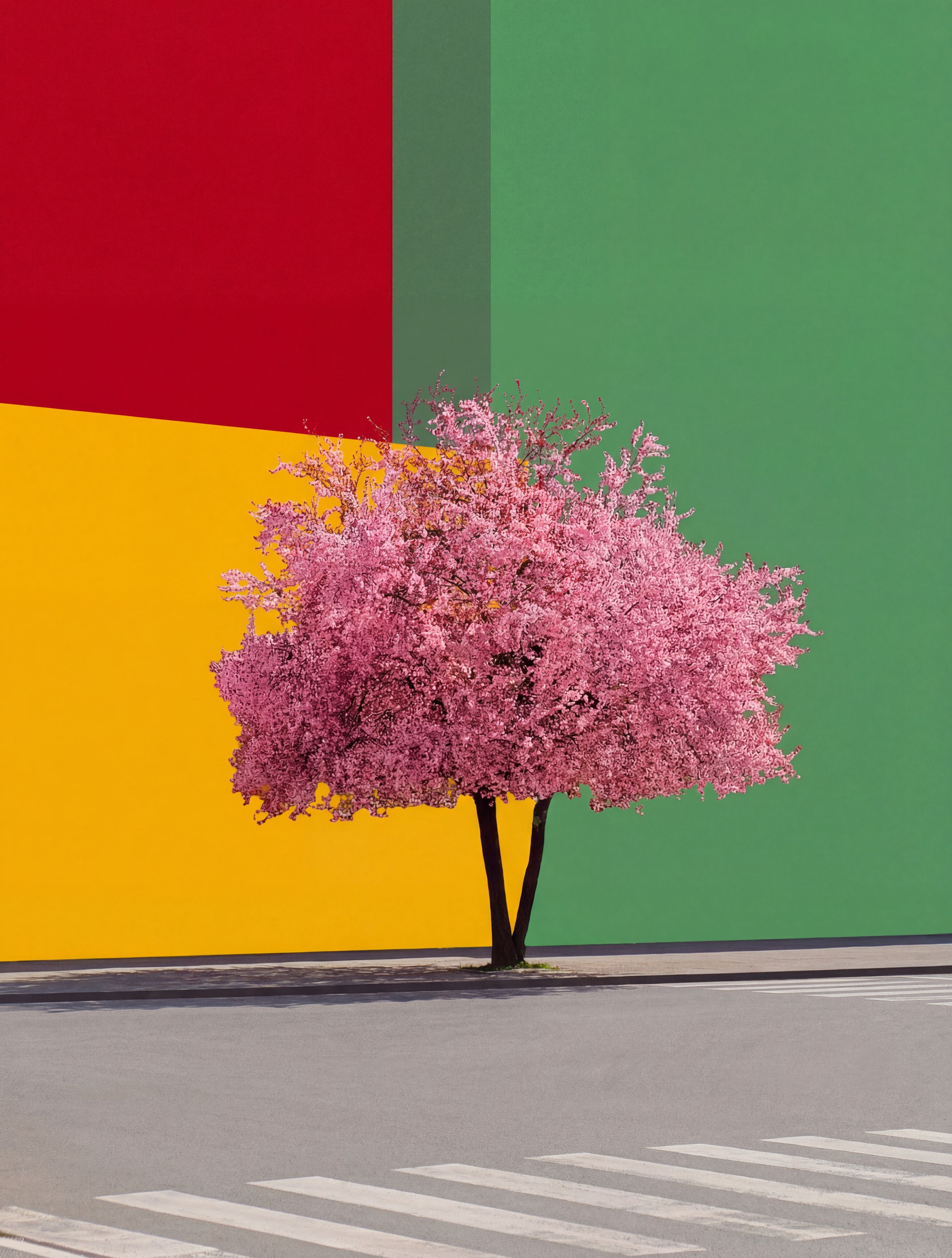 Александр, снимок сильный — цвета настолько яркие, что почти не верится, что это реальность. Дерево в розовых цветах на фоне красно-жёлто-зелёной стены — как будто из графического дизайна, но при этом очень живо.