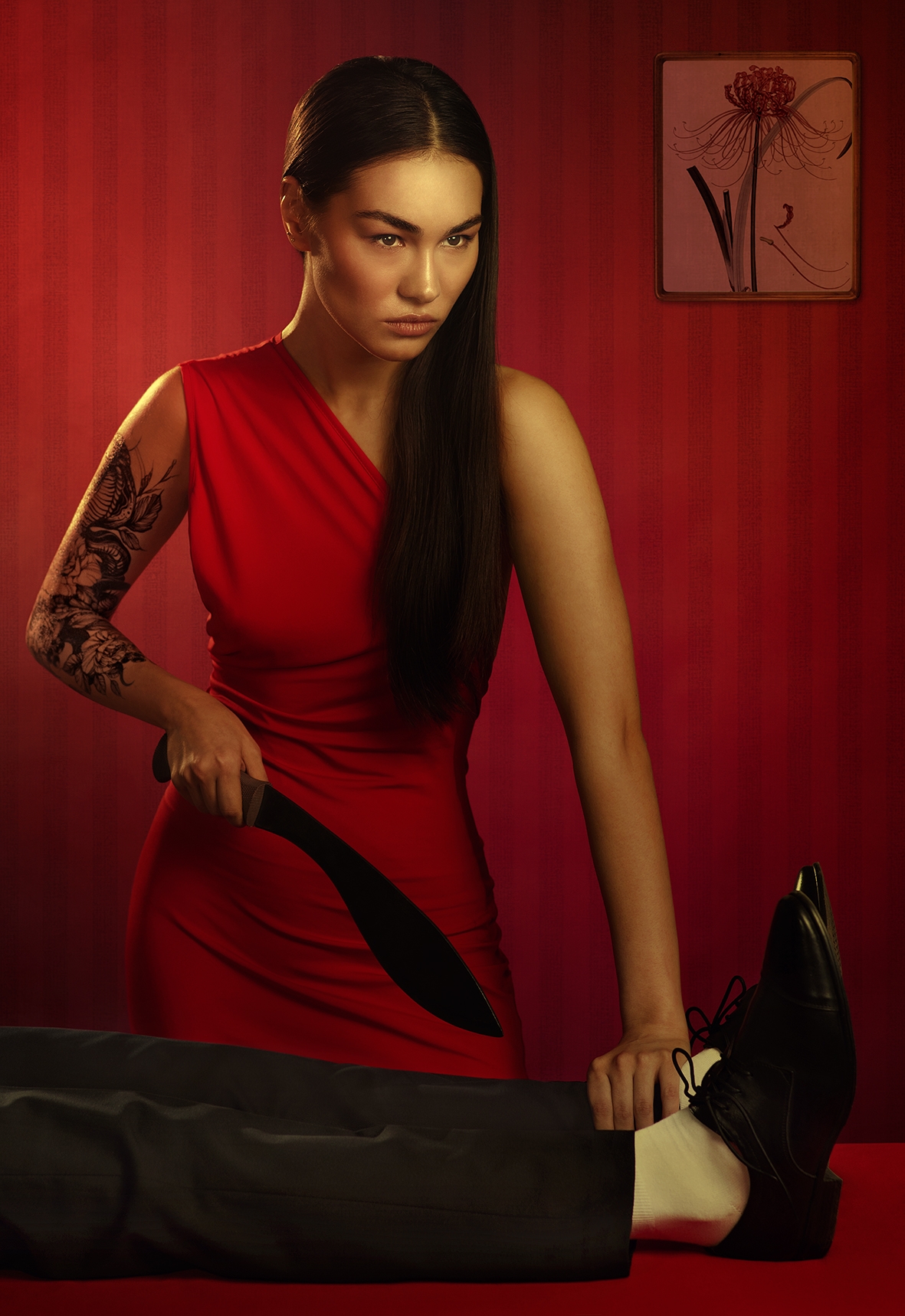 Красный — как пульс, а взгляд — как нож, вонзённый в тишину. Вы снова уловили этот напряжённый баланс между элегантностью и силой — узнаваемо, как всегда.