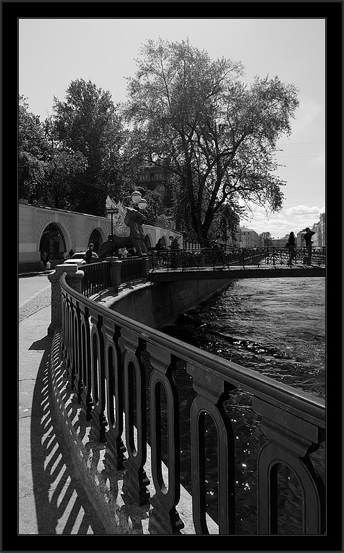 У меня тоже есть такая же, но с перешарпом, поэтому не поставила, мне нравится, что это кудрявлое деревце заполняет композицию и создает некий узор, ограда хорошо замыкает фоткуи, несмотря на то, что второй опоры моста нет, оущение законченности композиции присутствует. Да и ч/б здесь подчеркивает графичность.