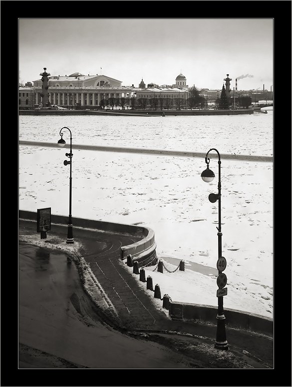 "Примерно здесь на месте Эрмитажного театра рядом с мостом при Петре стоял его Зимний дворец. Отсюда с высоты второго этажа Он также смотрел на серую ледяную реку. Здесь на втором этаже Он и умер - непонятый и преданный - в холодный зимний день..."