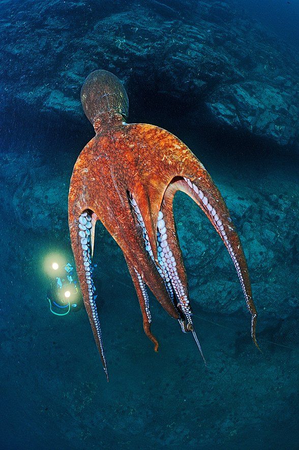 Гигантские осьминоги Дофлейна вполне неплохо плавают, как у дна, так и в толще воды. Иногда, для того чтобы уйти от навязчивого дайвера, осьминог стартует к поверхности и у него все получается. Для движения он использует воронку, через которую он прокачивает воду, используя реактивный принцип. Этакий истребитель 5-го поколения с изменяемым вектором тяги. Две лапы образуют крылья, а остальные -несущий фюзеляж. Фантастический самолет ...