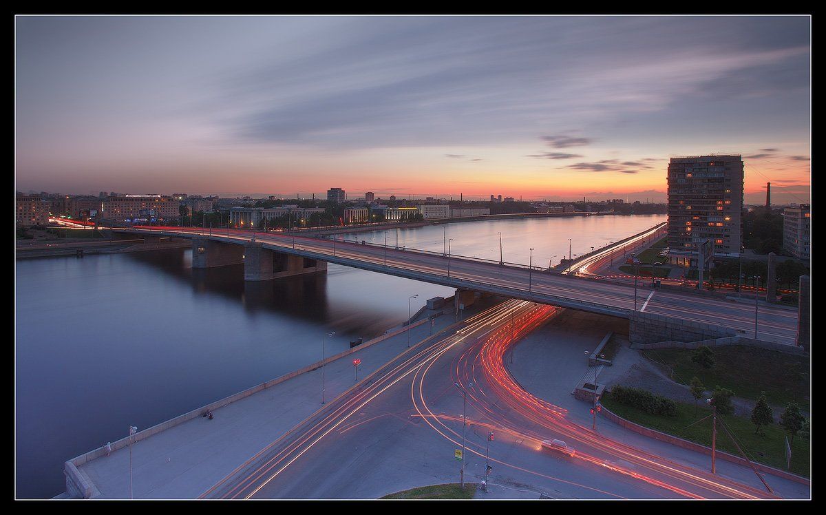 ... дома по Октябрьской набережной города на Неве с видом на Володарский мост, снятая в районе начала первого ночи в теплой компании. Длинная выдержка.