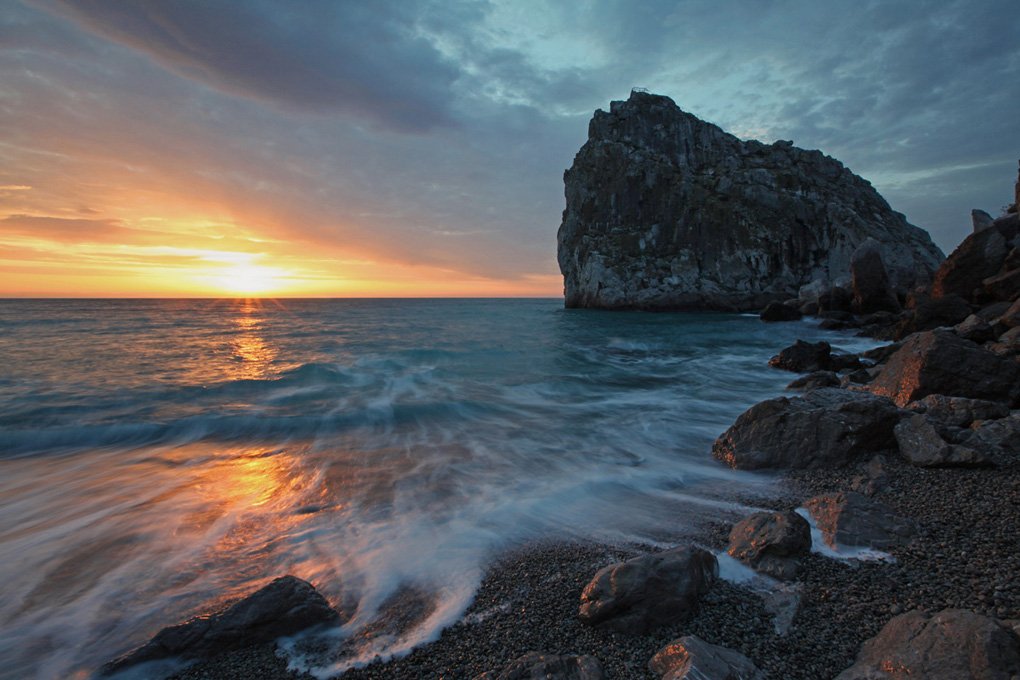море, расвет, восход, солнце, небо, облака, свет, вода, волны, скалы, камни, берег, крым, пейзаж, природа, горизонт,украина,, Сергей Шульга