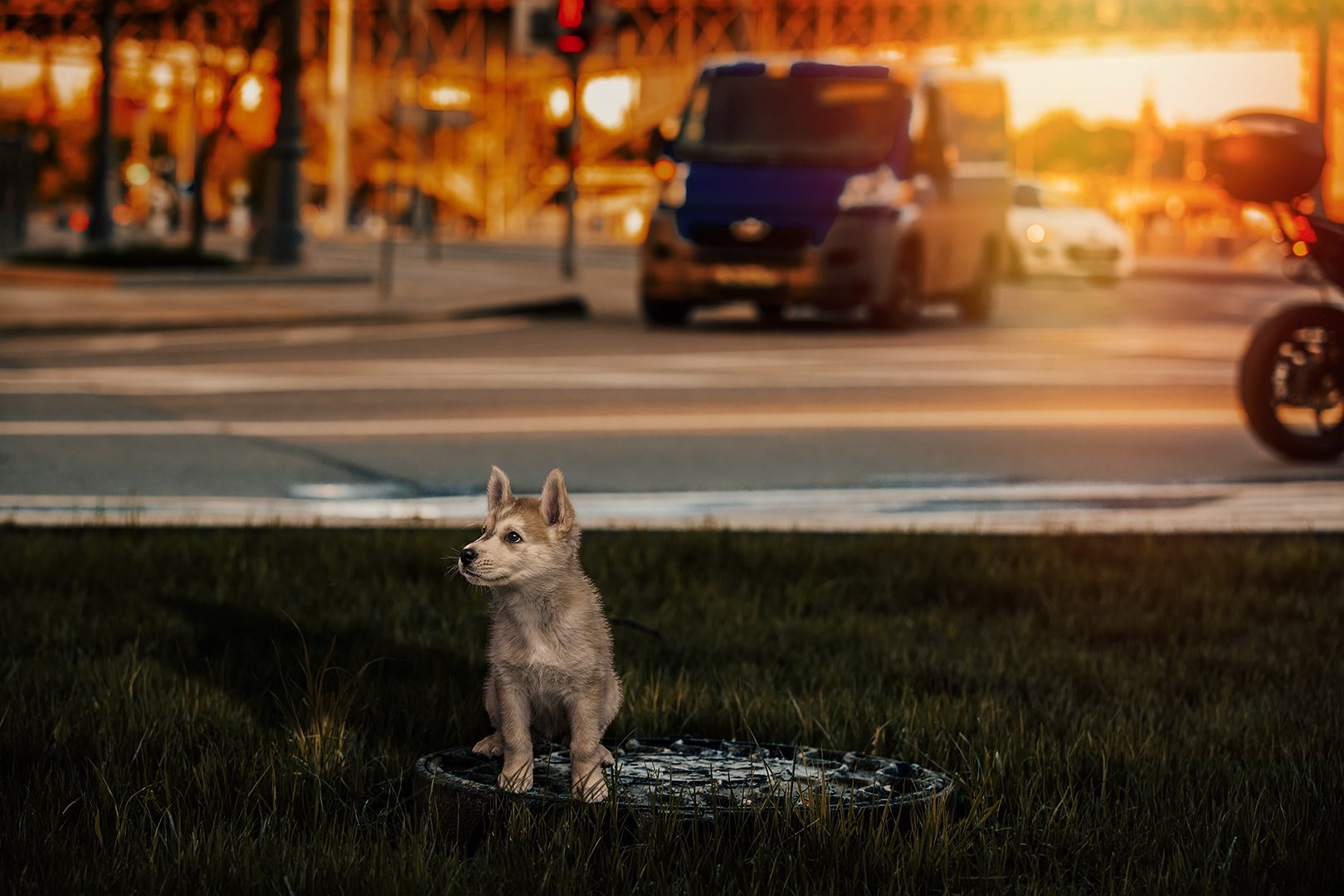 собака; щенок; одинокий; бездомный; закат; город; солнце; мегаполис; домашнее; животное, Юрий Шурчков