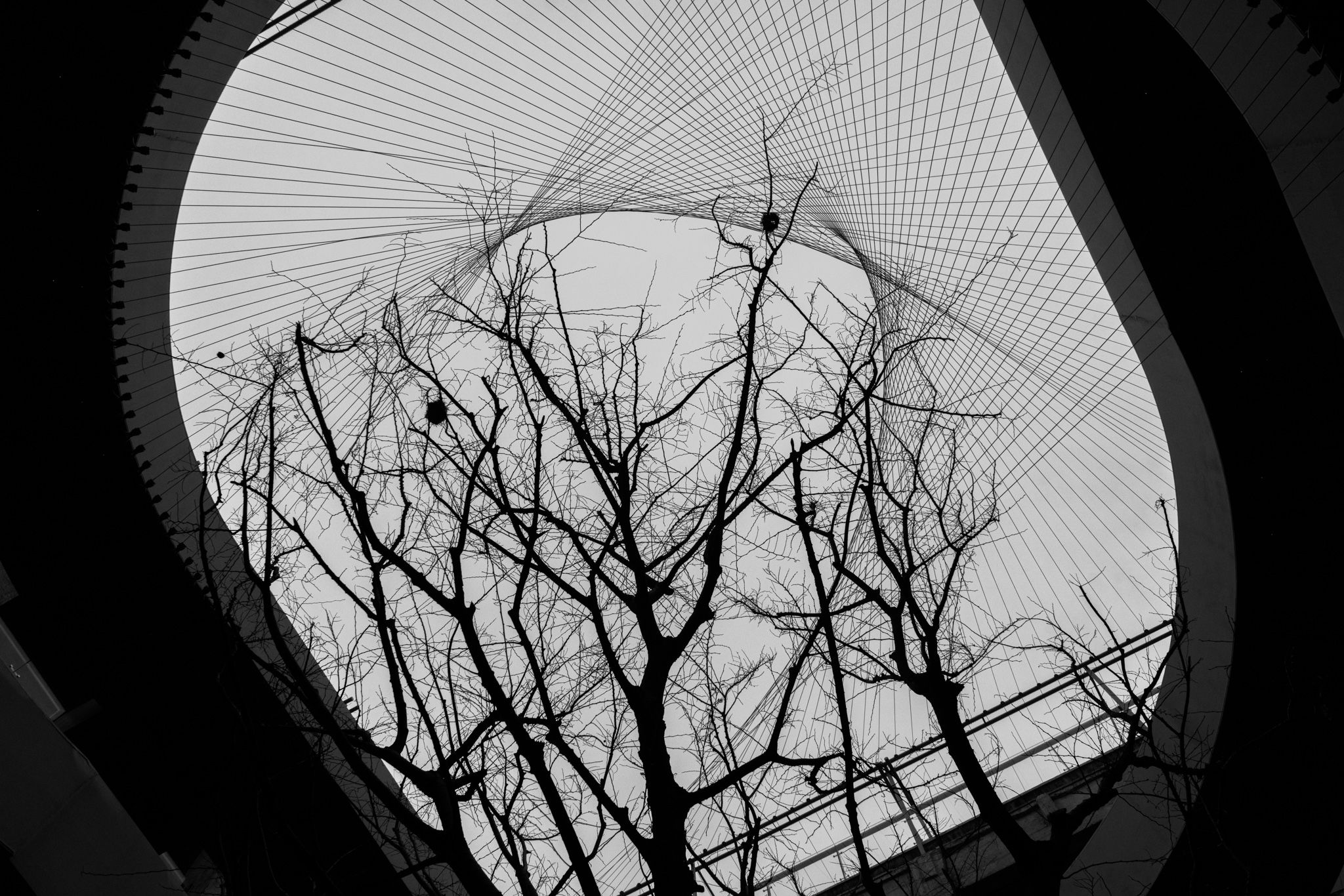 Capturing the surreal beauty of an abandoned shopping mall, our black and white photograph reveals an ethereal scene. With the camera angled upwards towards a grey cloudy sky, an oval-shaped atrium steals the focus. Intersected by a tangle of cables and juxtaposed with barren tree branches, this forgotten oasis embodies a haunting elegance.