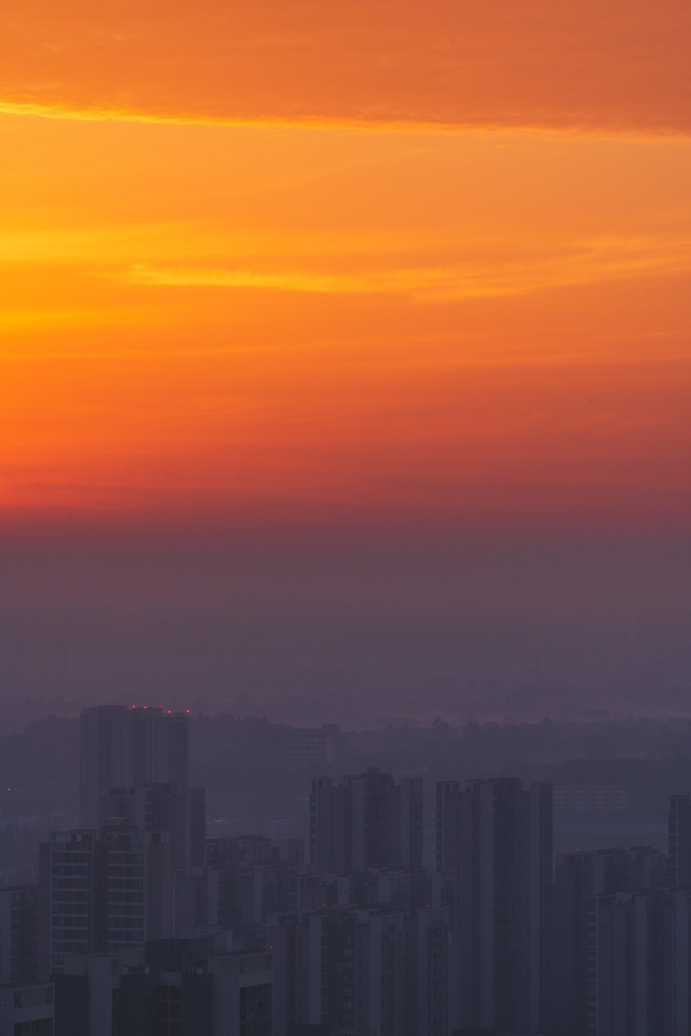 Step into a captivating urban dreamscape at sunrise, where the metropolis is bathed in a mesmerizing blend of fiery oranges and ethereal blue-purple shades. As the city awakens, tall buildings emerge from the twilight, while pulsating red lights atop provide a luminous touch, resulting in a spellbinding visual tapestry.