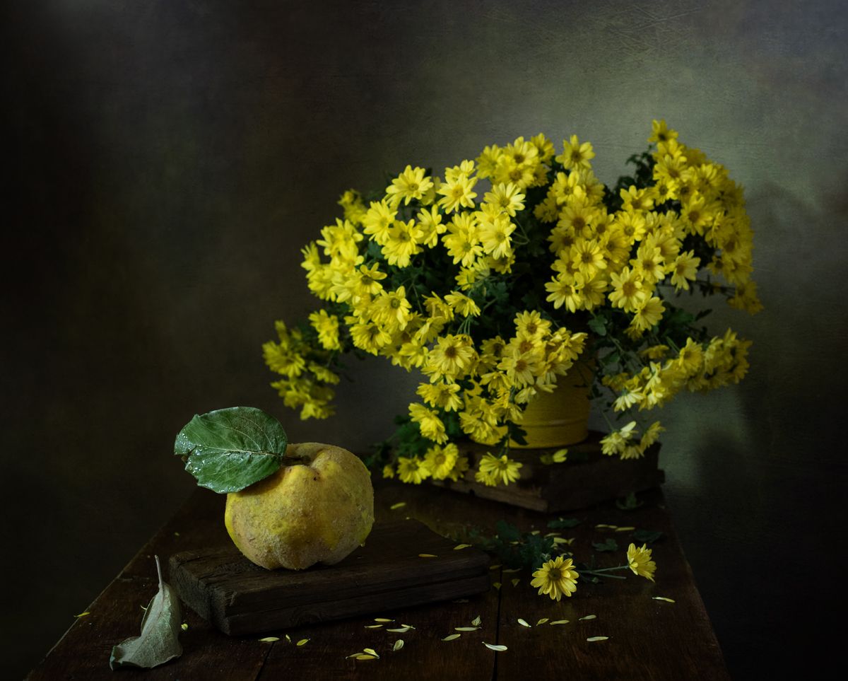 натюрморт, фрукты, цветы, айва, хризантемы, Оля
