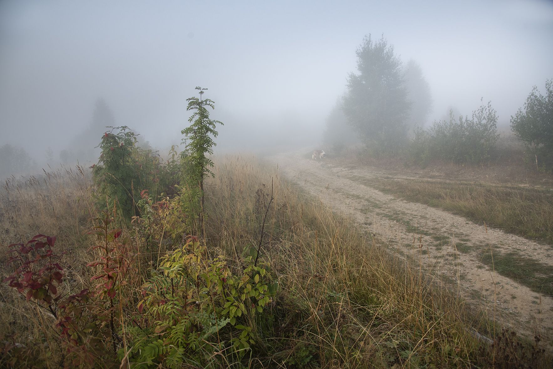 Как хороши заросли рябинки у дороги на фоне молочного тумана ,- смотрю и не могу насмотреться! И Тина у поворота дороги что-то учуяла (привет ей из Питера). Здорово!
