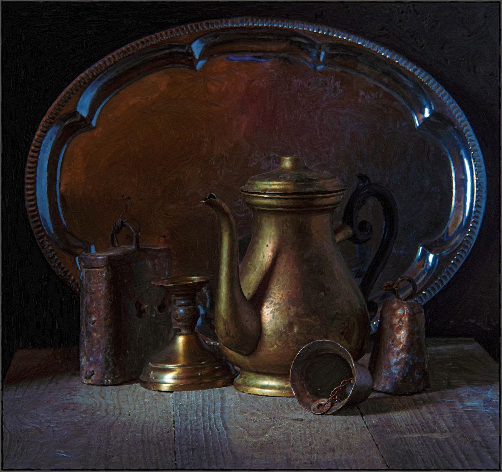 Мрачноватая, но сильная композиция. Предметы, словно, войско выступают в поход во главе с ещё целым кофейником.А на блюде вспыхивает зарево их будущих побед!