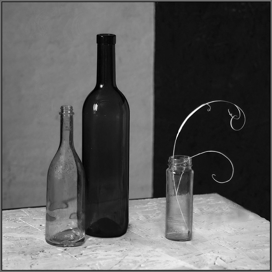 Милый, изящный завиток сухой травинки ,-белое на чёрном. вовлекает в движение парочку одиноких бутылок на белом. И они, если присмотреться, принимают приглашение к танцу.И это- не рождественская сказка, а рука Мастера.