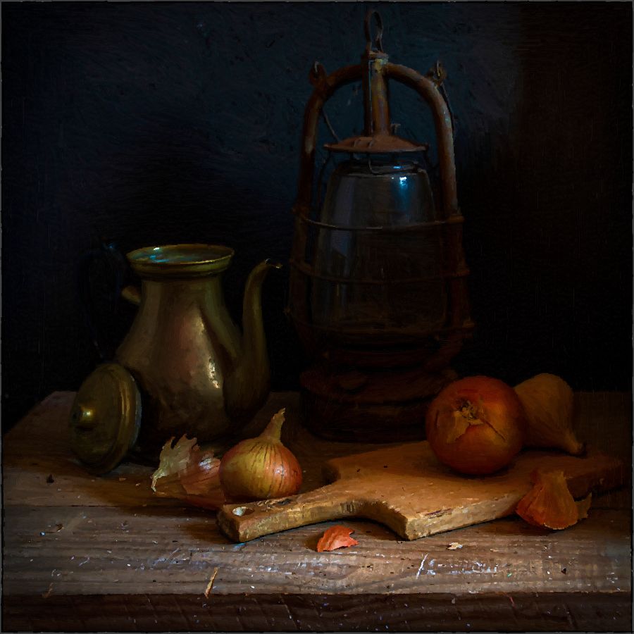 Так хорош контраст между тёплым, домашним, волнующим светом на первом плане и густым , ночным фоном.Оттого предметы кажутся живыми, хранящими тепло рук человека, словно только что вышедшего на минутку.Здесь есть и мысль и рука художника!