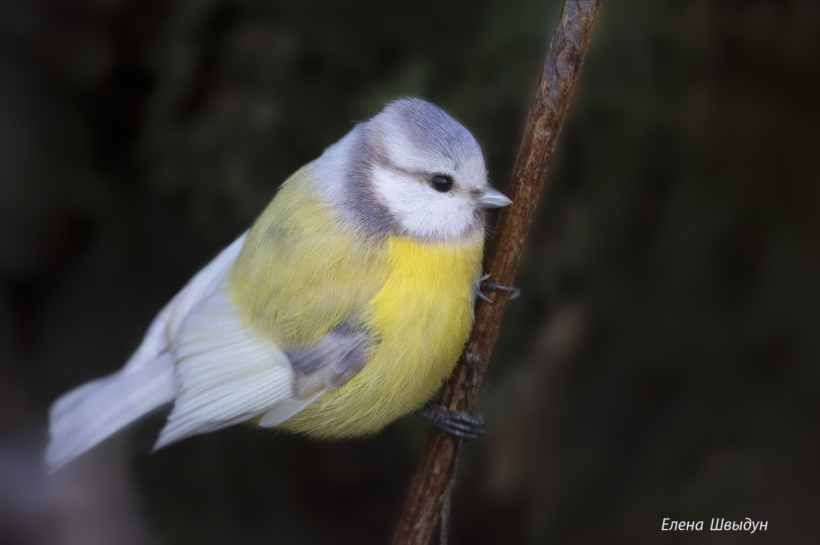 Вы сняли лазоревку с редкой окраской — яркий жёлтый брюшной цвет и мягкая серо-белая голова создают необычное, почти нежное сочетание. Фотографии передают тонкую природную аномалию с уважением к деталям.