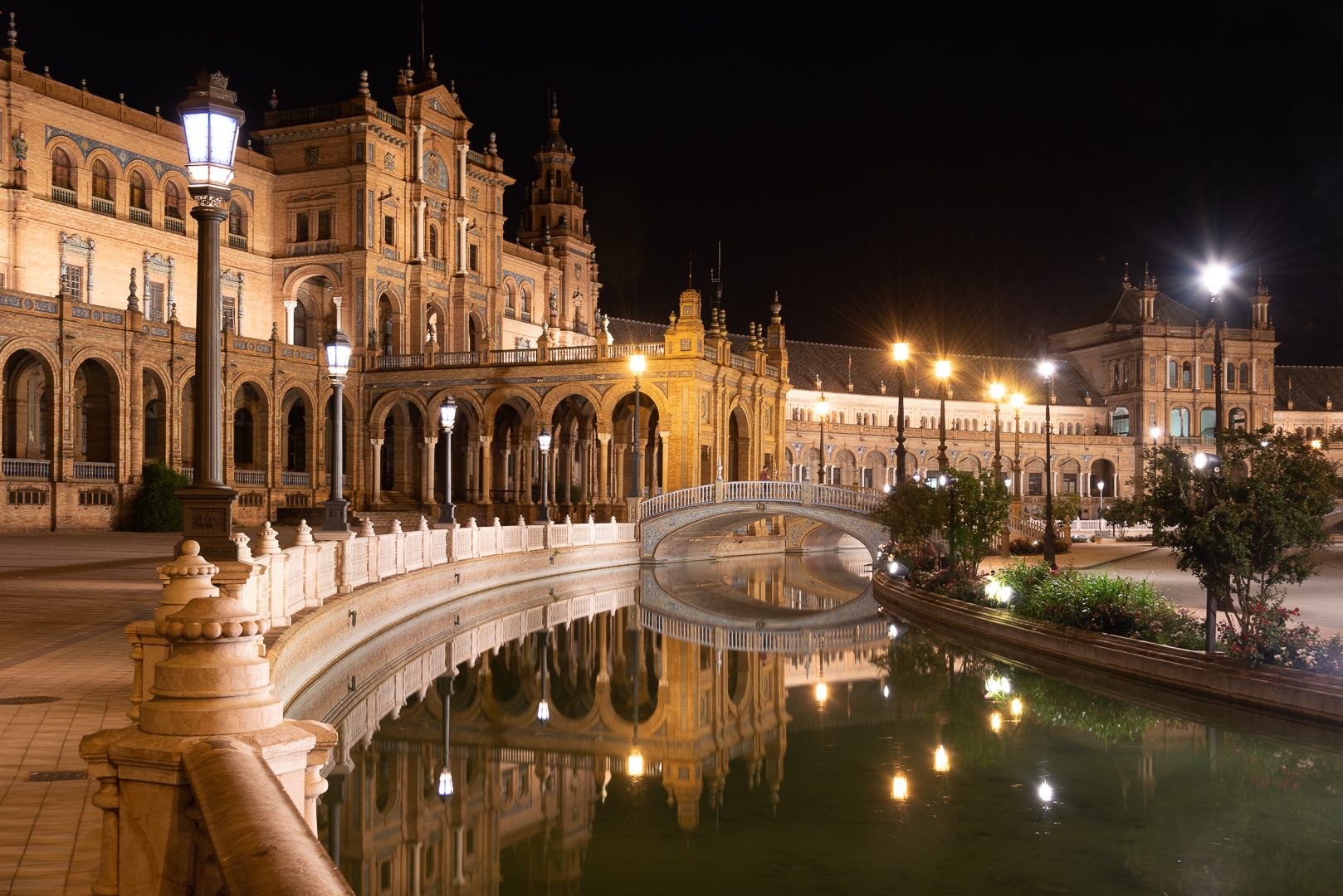 night; place; sevilla; cityscape; water; reflections; travel destinations; famous place; architecture; outdoors