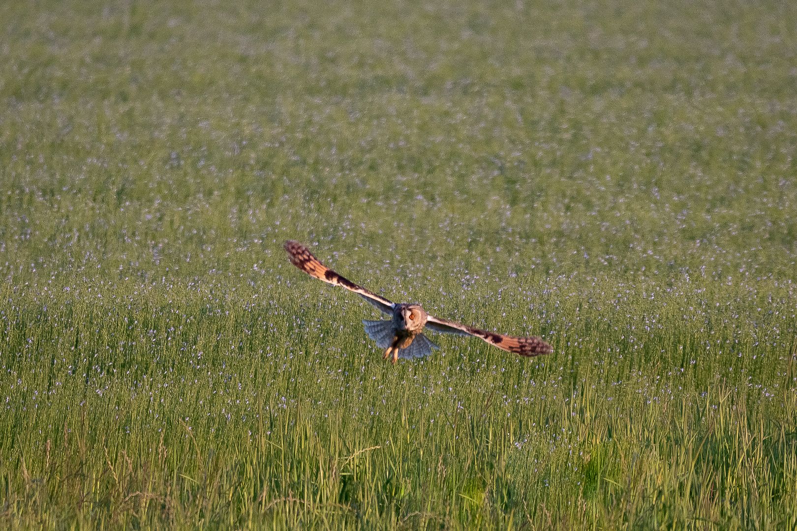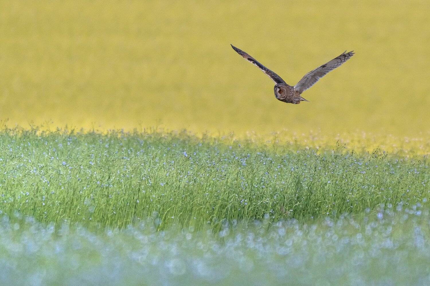 hibou à la chasse au dessus d'un champ de lin. La floraison du lin apporte une nouvelle couleur au tableau.