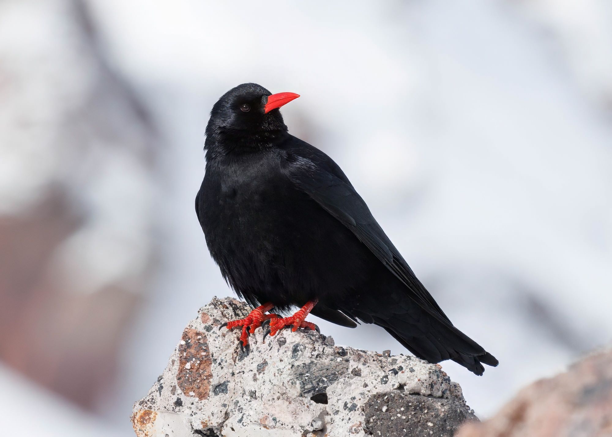 Совершенно неожиданно встретила клушицу среди альпийских галок на Эльбрусе. По идее, птицы этих очень близких видов не пересекаются, поскольку живут на разных высотах. Но, видимо, во время зимних кочёвок бывает всякое.