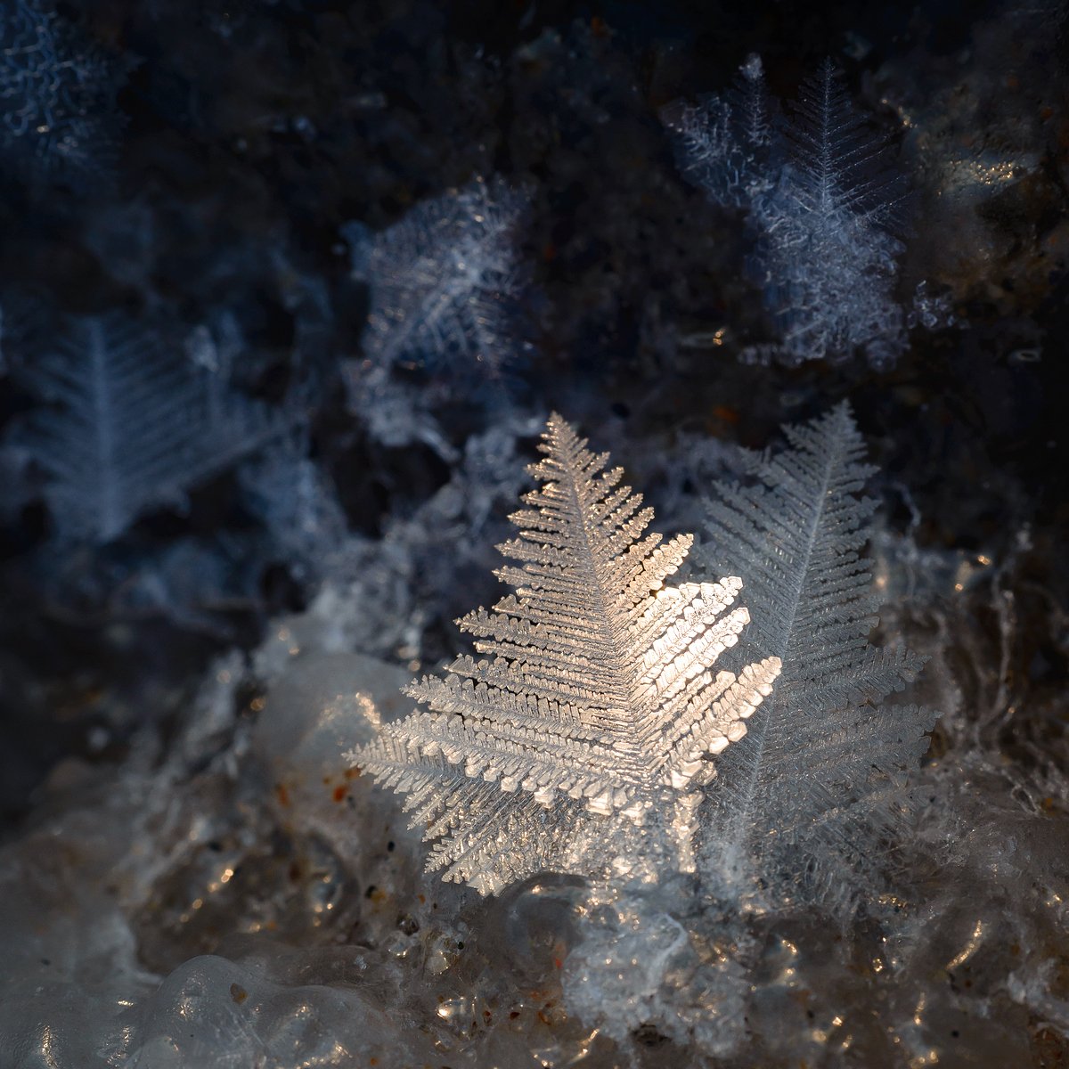Охотское море, из проекта "Зимовка на Сахалине". Снежные кристаллы на берегу моря в сильный мороз, размер 2 см. Приходилось ползать по льду, рискуя искупаться :)