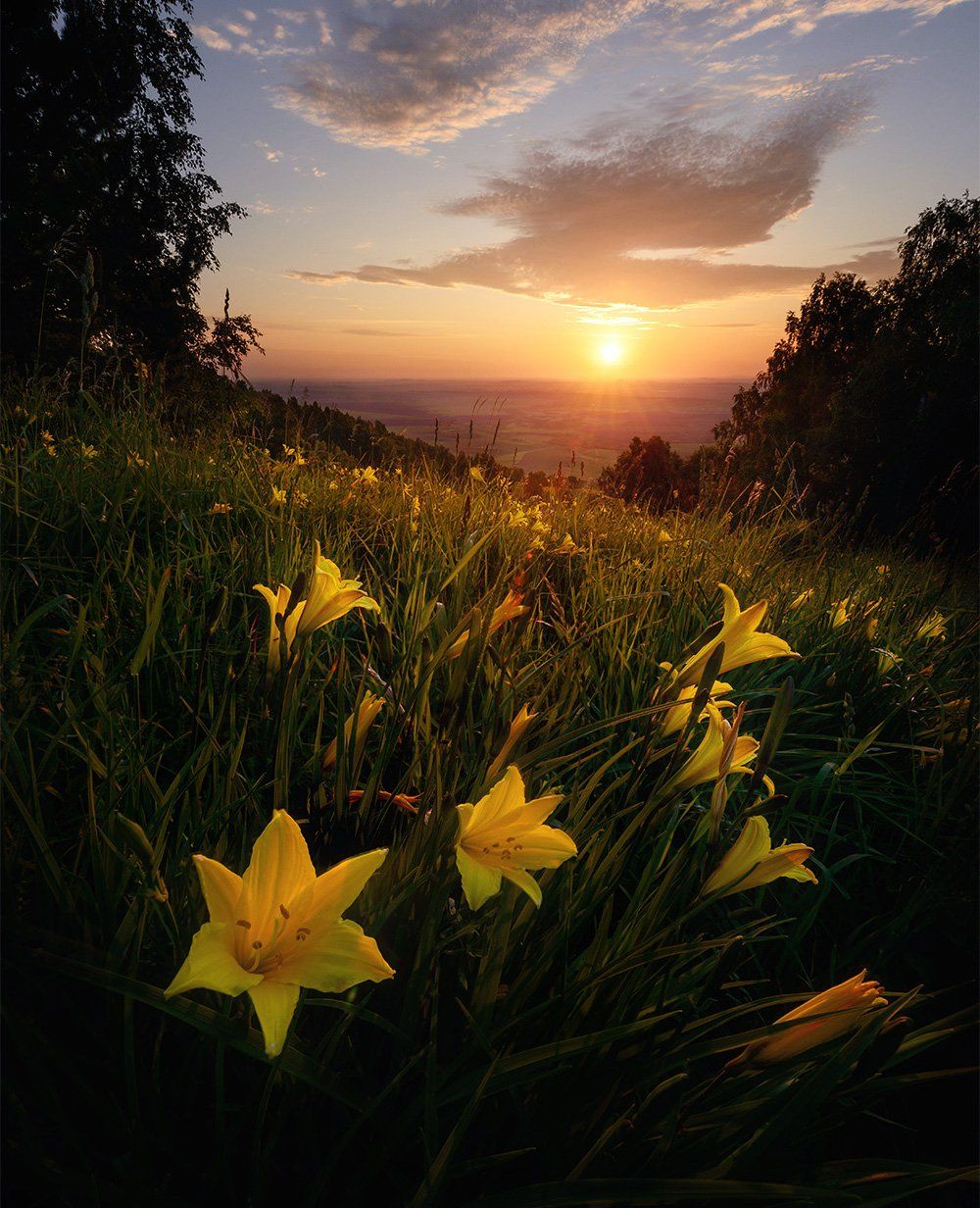 алтай, белокуриха, пейзаж, восход, утро, лилия, , горы, небо, облака, солнце, свет, лето, Павел Силиненко