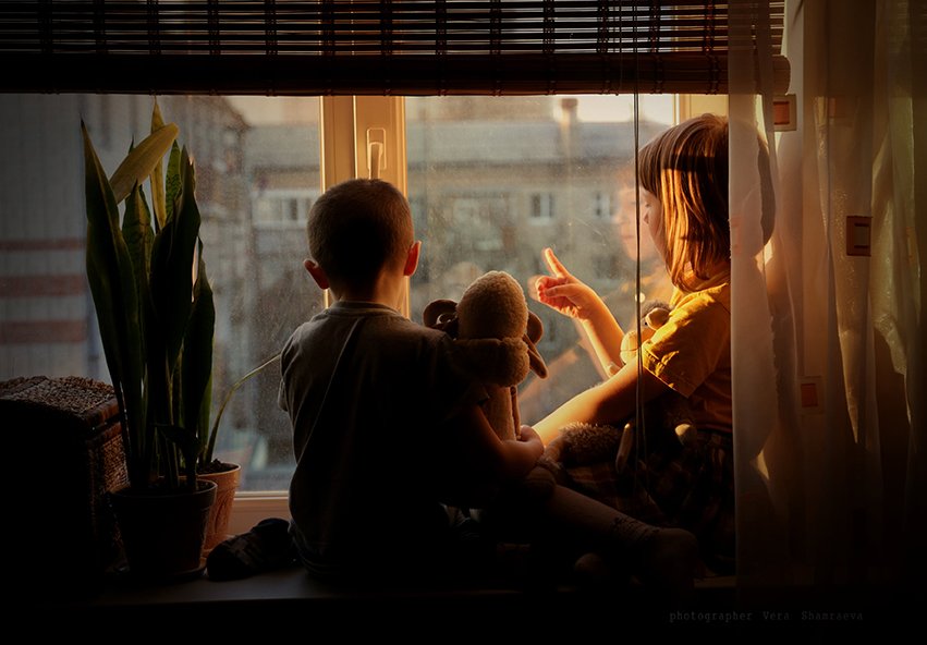 вечер, мальчик и девочка на подоконнике, Вера Шамраева