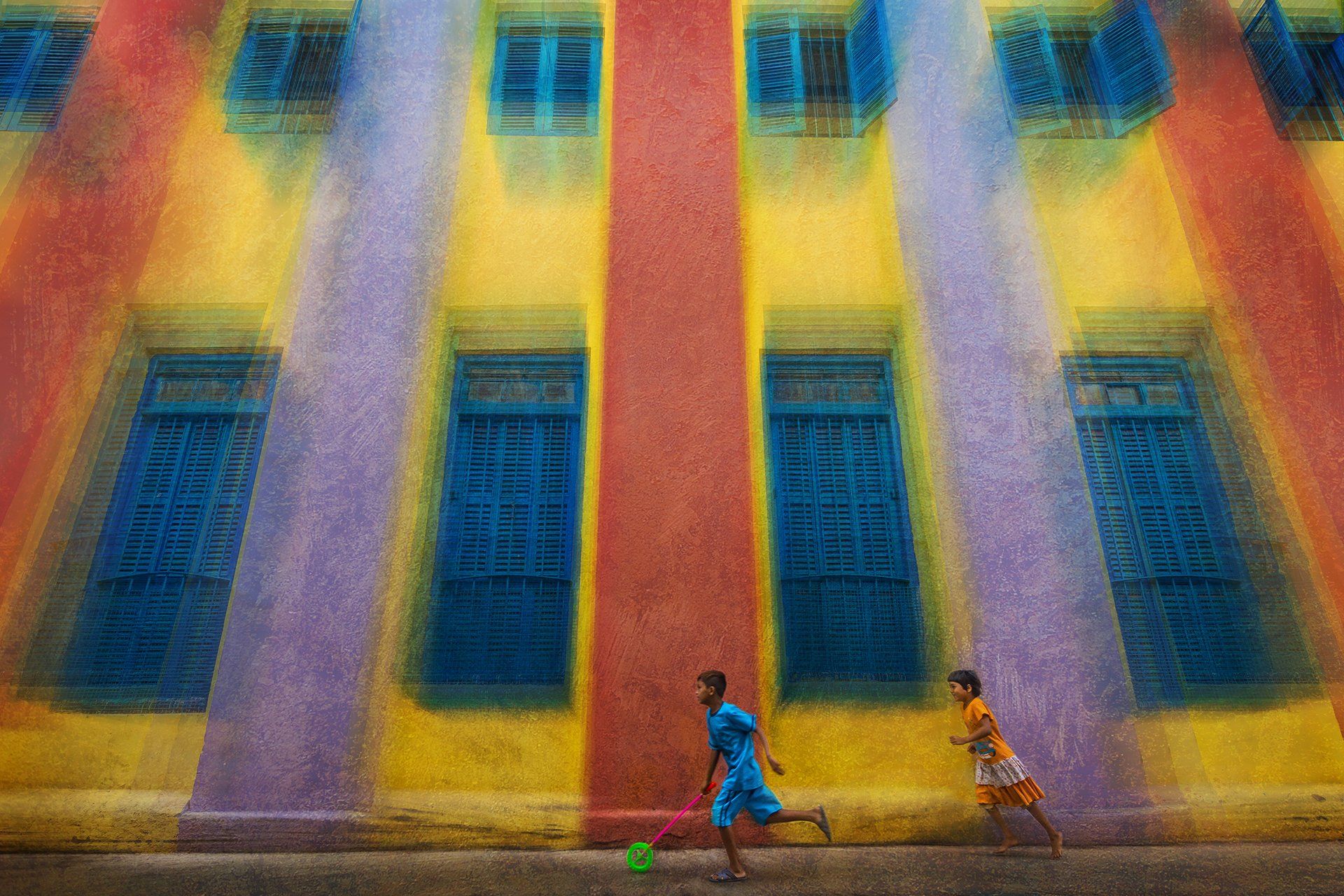 This shot of rural siblings enjoying a play with a toy wheel was taken at a street of Kolkata, West Bengal. they love to play with this stick having a background of colorful striped building. Edited with the Photoshop.
