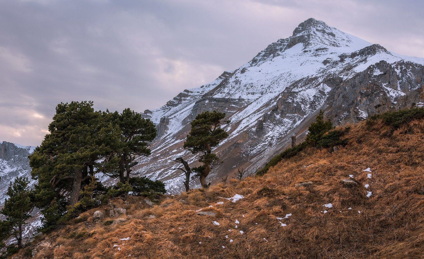 Можно противоположность сделать: "Последний снег в низинах", как раз актуально по сезону, но нужно постараться, потому что горы - сами по себе вне конкуренции!)