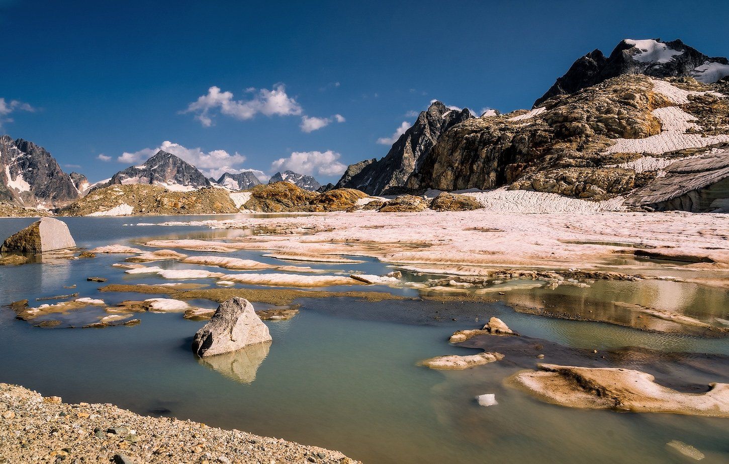 Поход по маршруту http://tursport.ru/tourists/tur-12-iz-dombaya-v-prielbruse-2-ya-kategoriya.html Перевал Кичи-Муруджу (Центральный) (3144 м.), 1А категории трудности. Голубое озеро со снежными берегами.