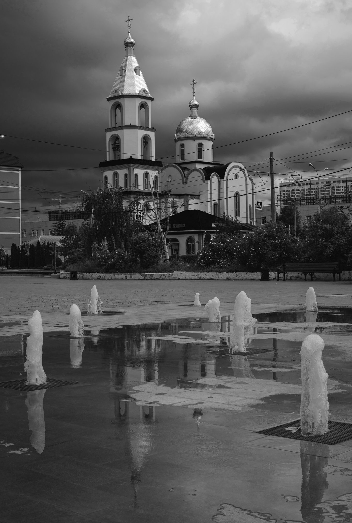 архитектурахрамправославиецерковь покрова пресвятой богородицыдождьотраженияфонтаныатмосферагородские видыsony a7 iiisony alpha ilce 7m 3mc helios 77m-4мс гелиос 77м-4кубанькрасота кубани