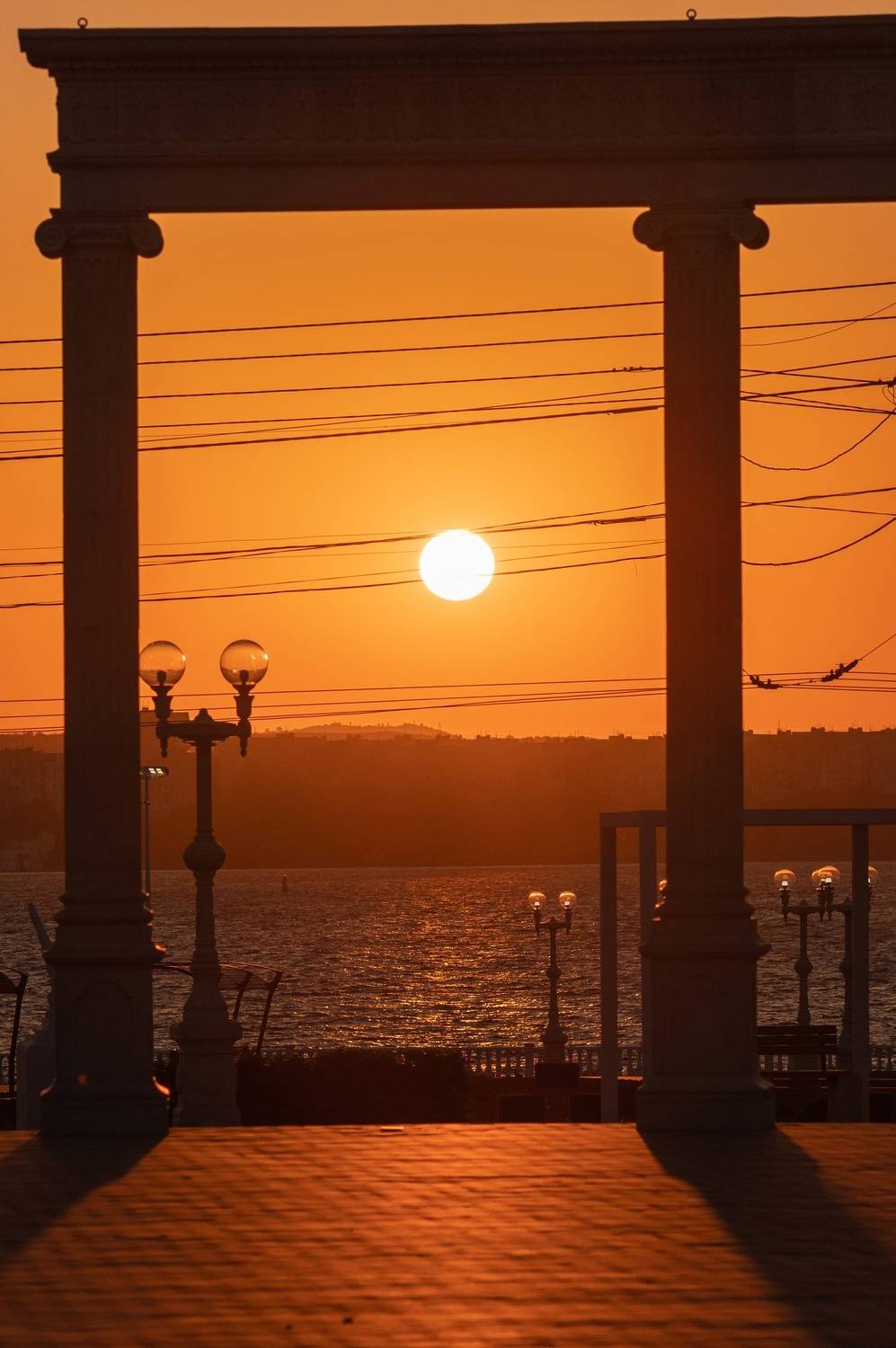 летоутровосходрассветсолнцеморезолототишинаатмосферагоризонтдисквозникновениепоявлениевоскресениеколоннадаплощадьгородскоеsony a7 iiisony alpha ilce 7m 3юпитер 37асоветская оптикакерчькрымроссия