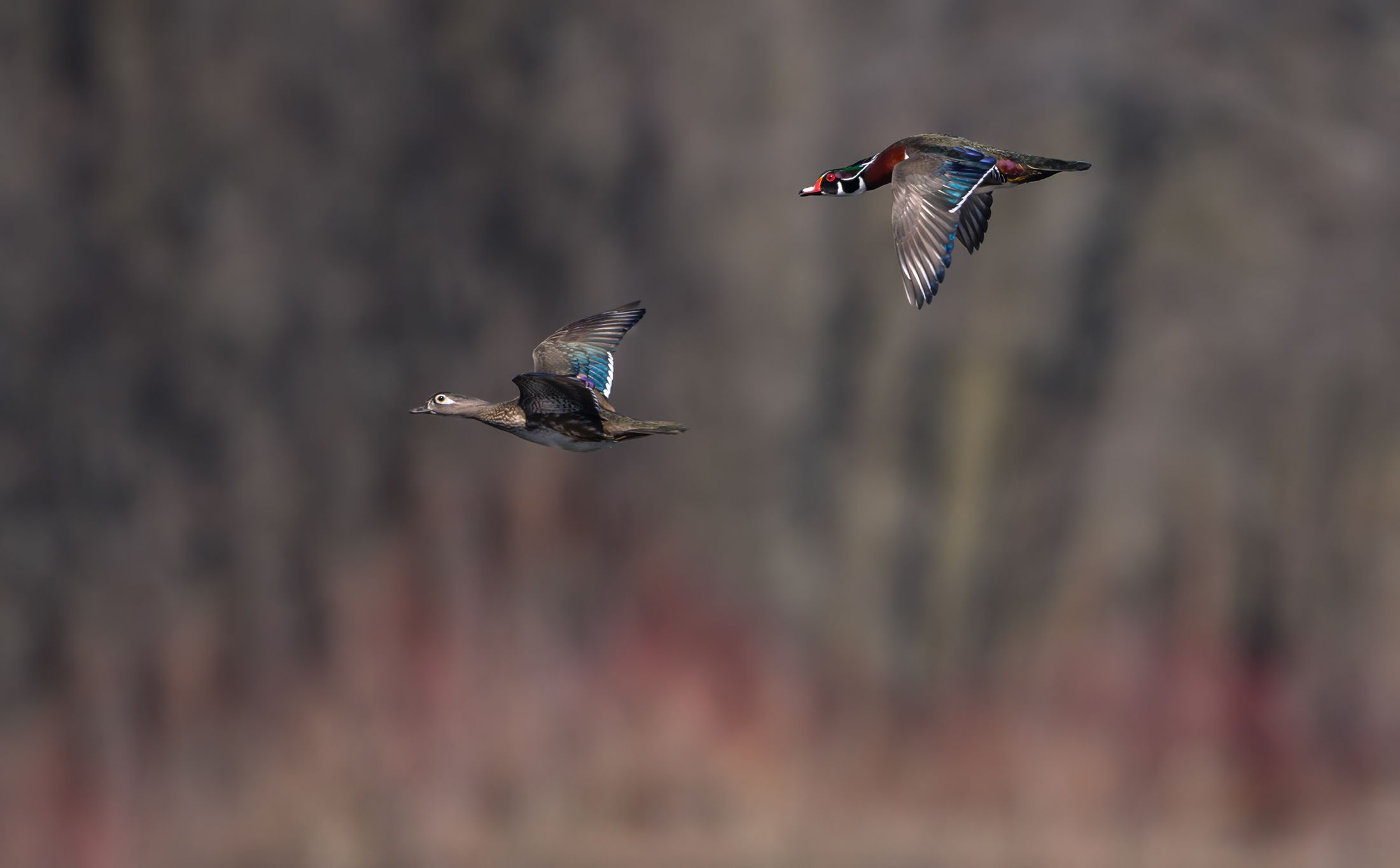 Сейчас короткий период , когда они парой летают, возможно ищут подходящее дерево для гнезда,я честно говоря древесную утку только раз и видел на дереве, хорошо прячутся...