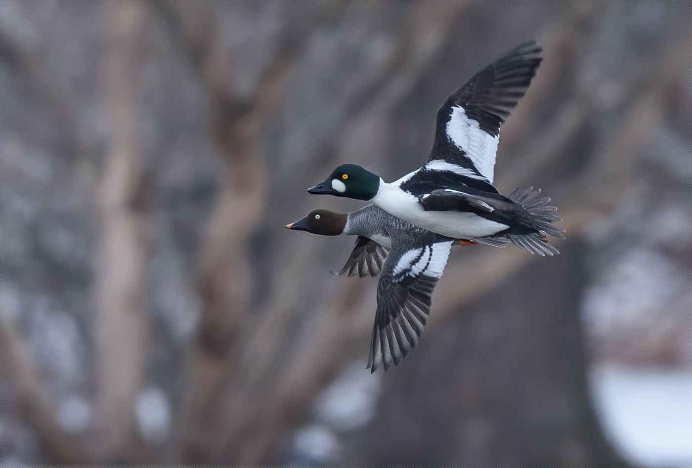 Common goldeneyes breed across the forested areas of Canada, Minnesota, Michigan, Alaska and the northeastern United States. They are most abundant among lakes of the Canadian Boreal Forests, especially where lakes or deep marshes have substantial invertebrate populations. They are cavity nesters and have a strong homing tendency, often using the same cavity in successive years. Nests are usually located near a pond, lake or river, but may be found in woodlands up to a mile from water. Female common goldeneyes nest in natural tree cavities, abandoned woodpecker holes or nest boxes and lay an average of 9 eggs.