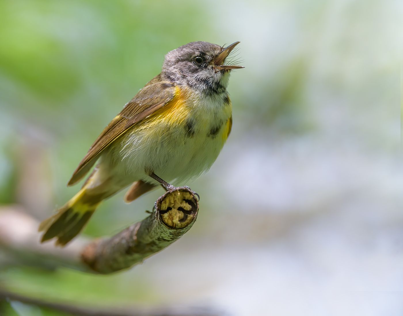 The American Redstart is referred to as "the butterfly of the bird world" because of its quick fluttering motions and bright orange color on the wings and tail.