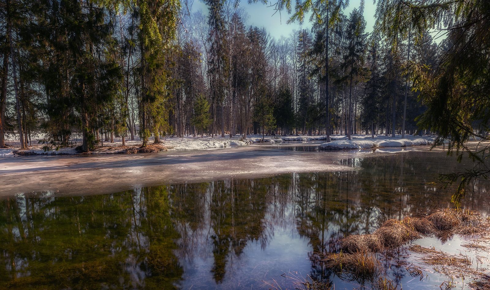 весна солнце небо пруд лед отражение ель март, Скороходов Константин