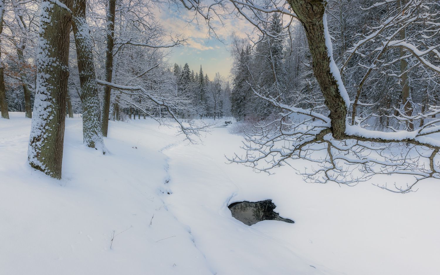 январь зима снег сугробы небо облака мороз река деревья, Скороходов Константин