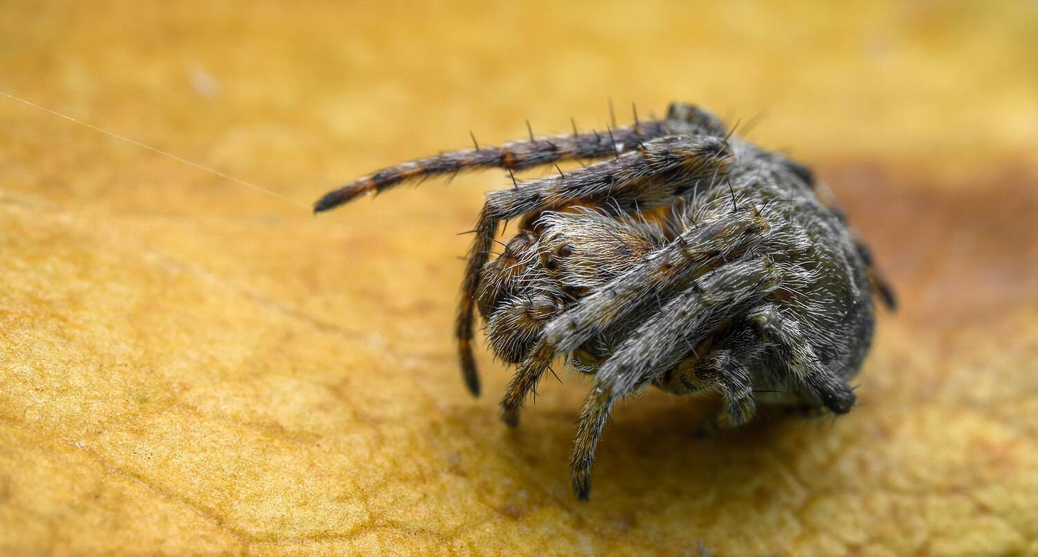 Паучка случайно принес домой вместе с сухими листьями. Он хотел спать и я никак не мог его снять "в лоб": паучок шустро залезал под листик и сворачивался. Его размер около 5мм.