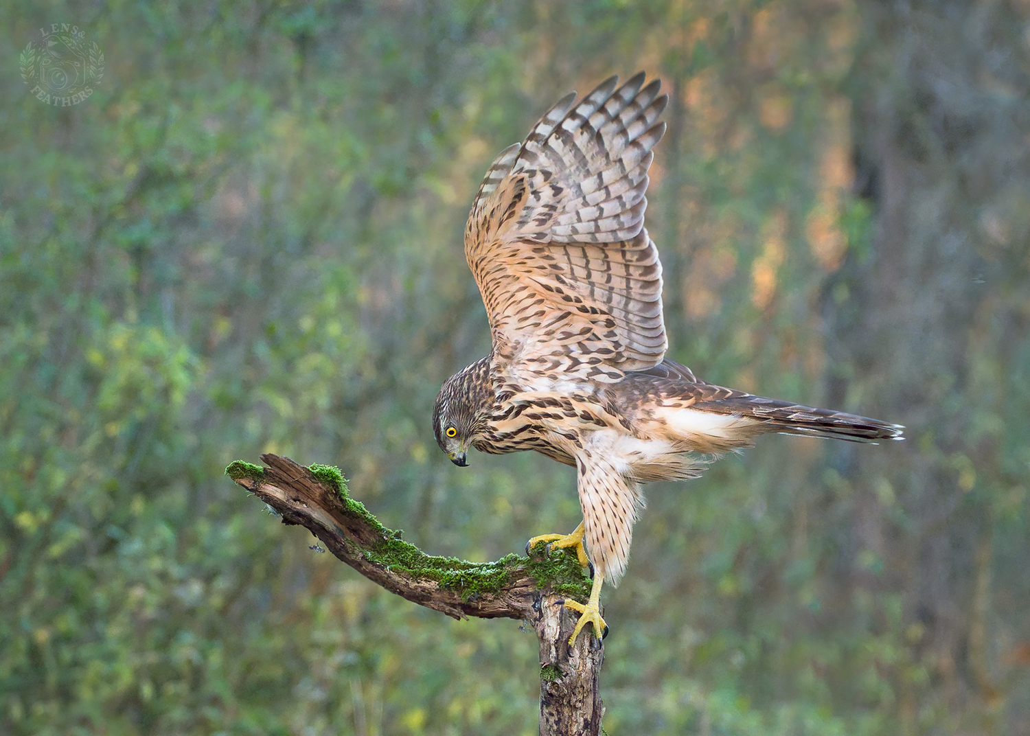 The hawk’s posture is strong—wings lifted, eye fixed, feet gripping the mossy branch. The light softens the edges of the feathers without flattening the detail. You’ve got the moment just before takeoff or landing, and the focus holds well on the bird while the background blurs naturally.