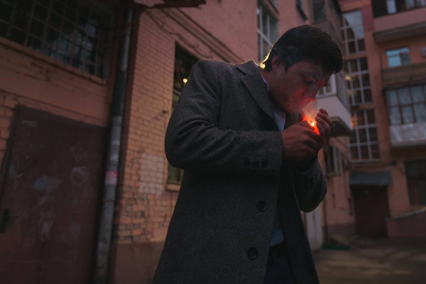 Улица, парень, курит, прикуривает, зажигает, поджигает, композиция, свет, пальто, подъезды, Иванов Юрий