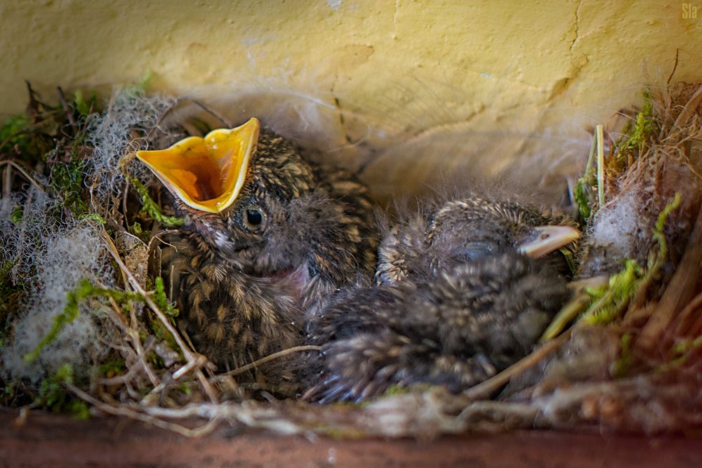 на балконе у меня - свили гнездо мухоловки - это маленькие птички ( меньше воробья) - и обычно их не просто сфотографировать - но тут как грится - у меня всё под рукой).