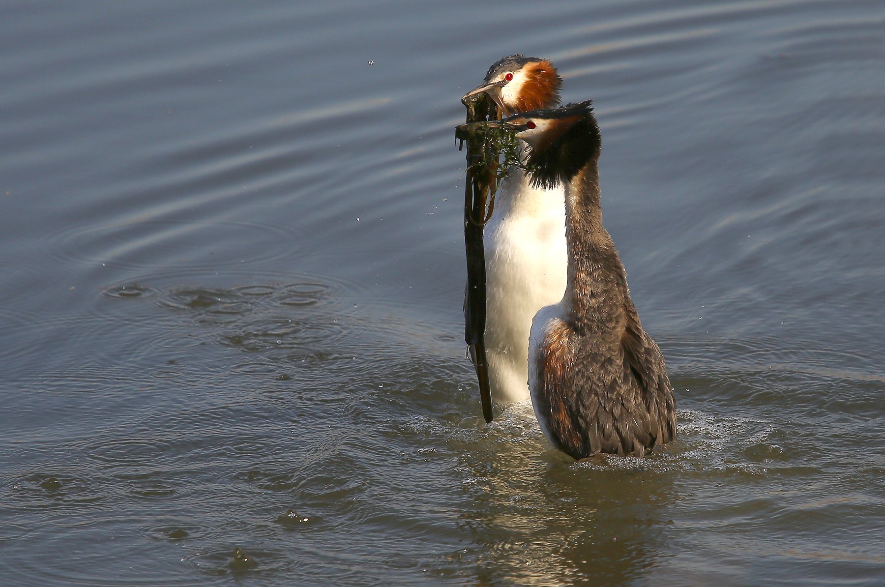 Брачные игры больших поганок проходят в воде, они очень необычны и имеют свой строгий ритуал. Чомги плывут друг к другу, перья воротника распущены, птицы трясут головами и сплываются вплотную. Затем встают в воде вертикально, в «позу пингвина», держа в клюве пучки водорослей и предлагают друг другу в качестве подарка.