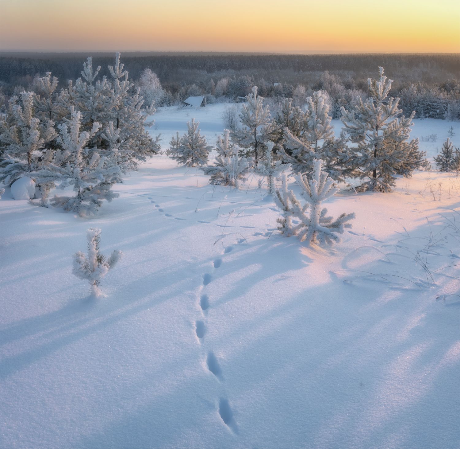вечер закат тропинка снег следы сосны домик зима, Сергей Буторин