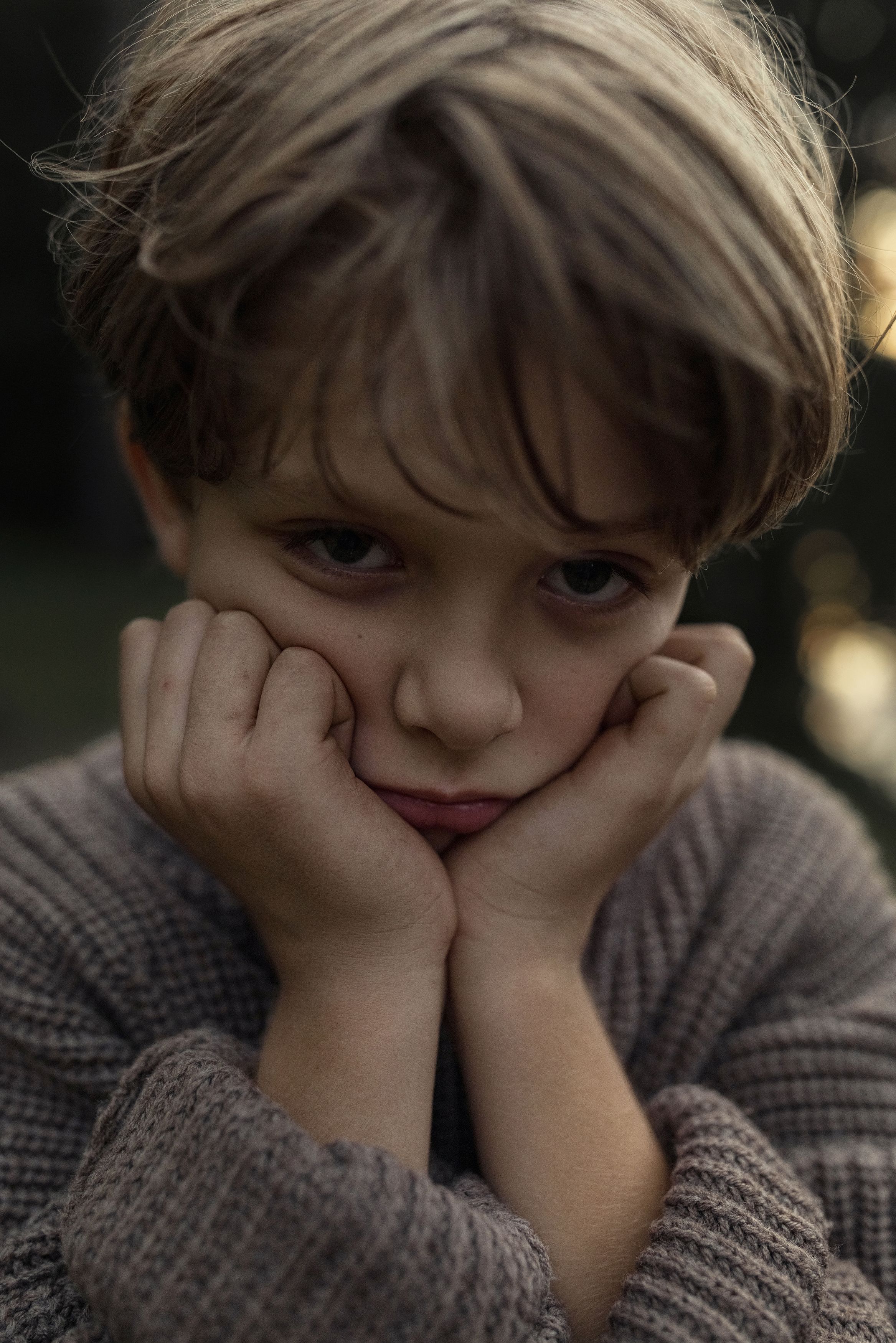 Марина, снимок передаёт глубину и тонкость детской эмоции — взгляд прямой, но задумчивый, поза напряжённая, но естественная. Текстура свитера и мягкий свет подчёркивают атмосферу. Хорошее освещение, сбалансированная композиция.