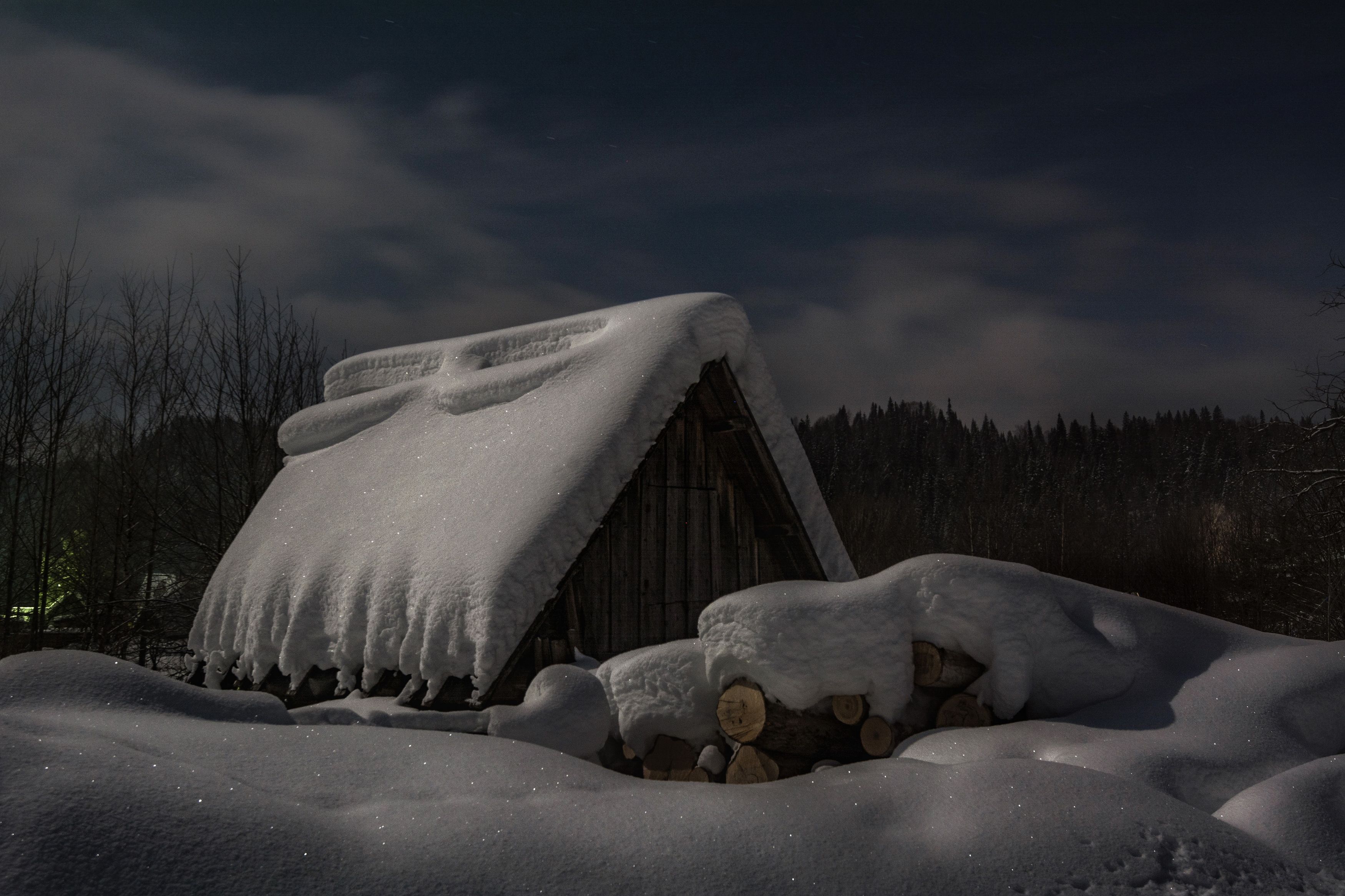 ночь, снег, зима, деревня, домик, луна, деревенский пейзаж, Соколова Елена